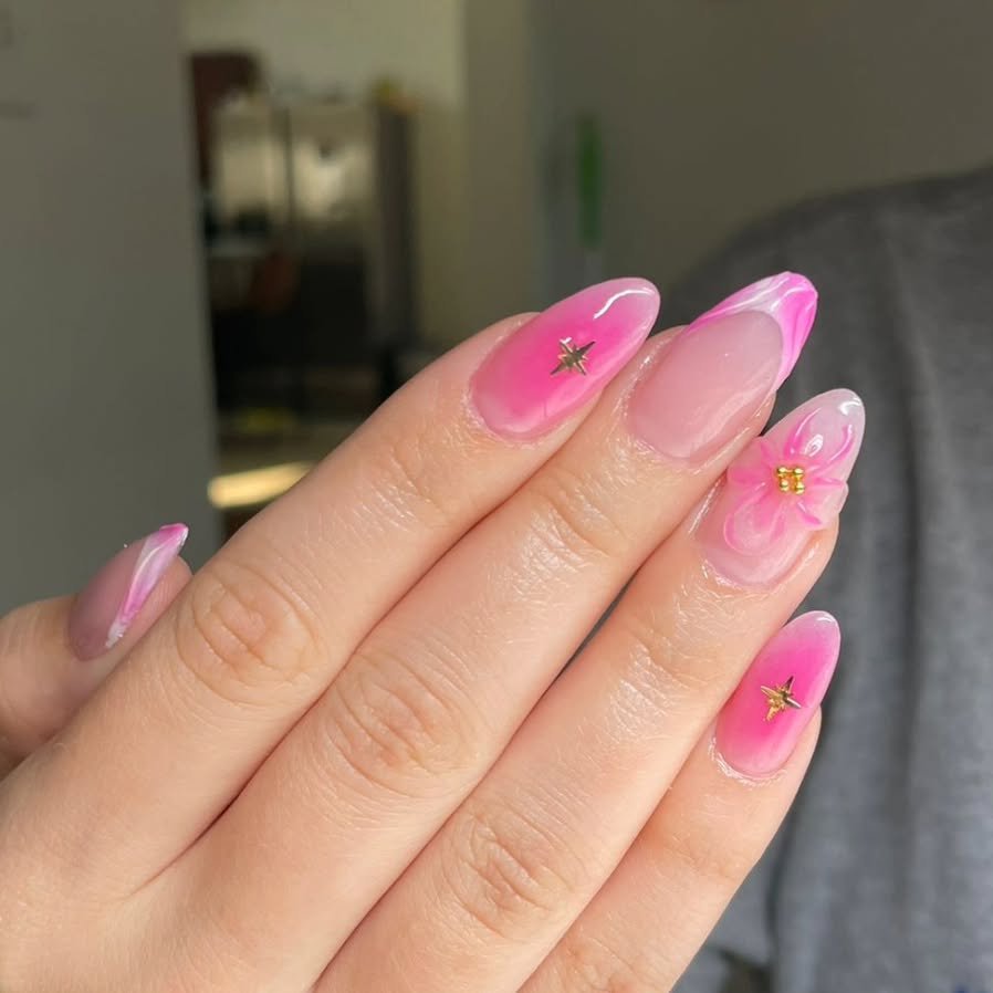 This mix of ombre pink, sculpted petals, and tiny gold stars gives the nails such a dreamy summer glow. The soft fade from nude to bright pink feels warm and sunny, and the 3D flower is the highlight of the set. The swirled pink tips make everything look fresh and lively. This design works beautifully for someone who wants nails that feel playful but still polished.