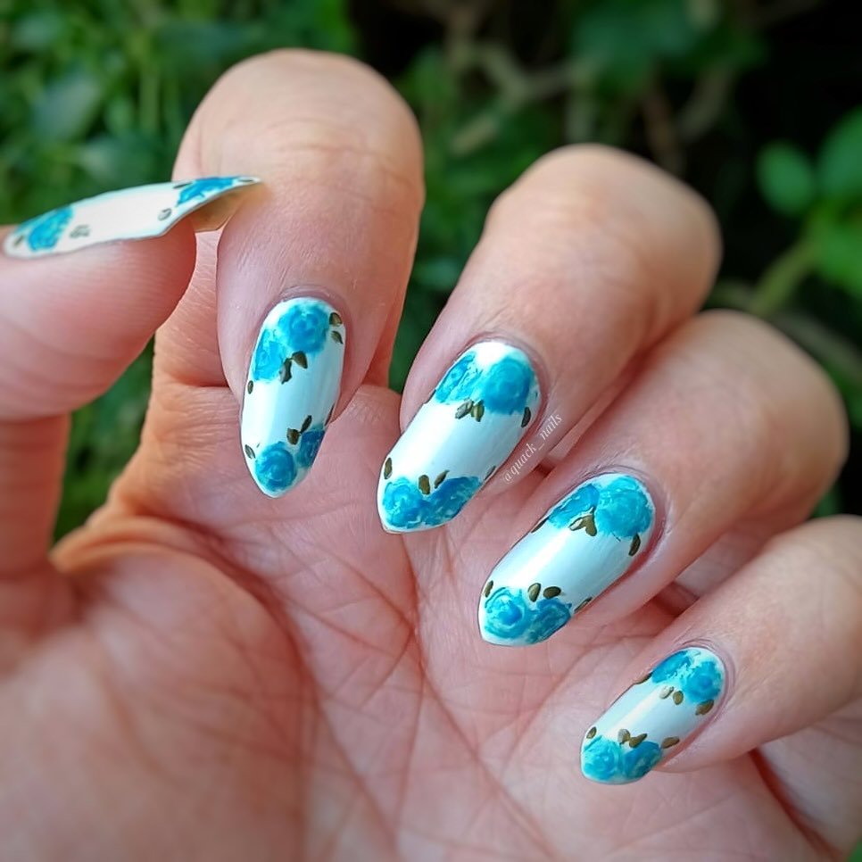 This set brings something fresh with hand painted blue roses on a clean white base. The petals have beautiful depth and shading, making the roses look soft and full. I love how unique the blue color feels for floral nails. It’s eye catching but still calm enough for everyday wear. A great choice if you want rose nails that stand out without going too bright.