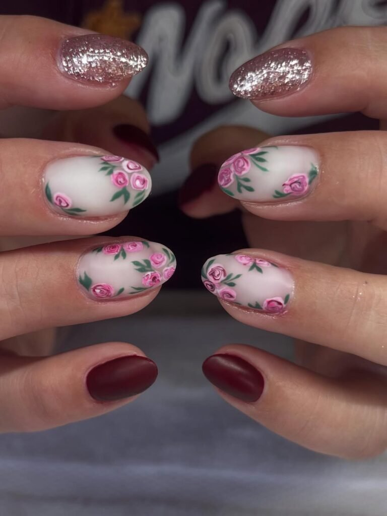 This manicure blends matte burgundy nails with soft white bases covered in tiny hand painted pink roses. The matte finish gives everything a velvety texture that feels warm and cozy. The floral accents look delicate and charming, almost like rosebuds pressed into the nails. Such a sweet option for anyone who loves romantic details but still wants a deeper color mixed in.