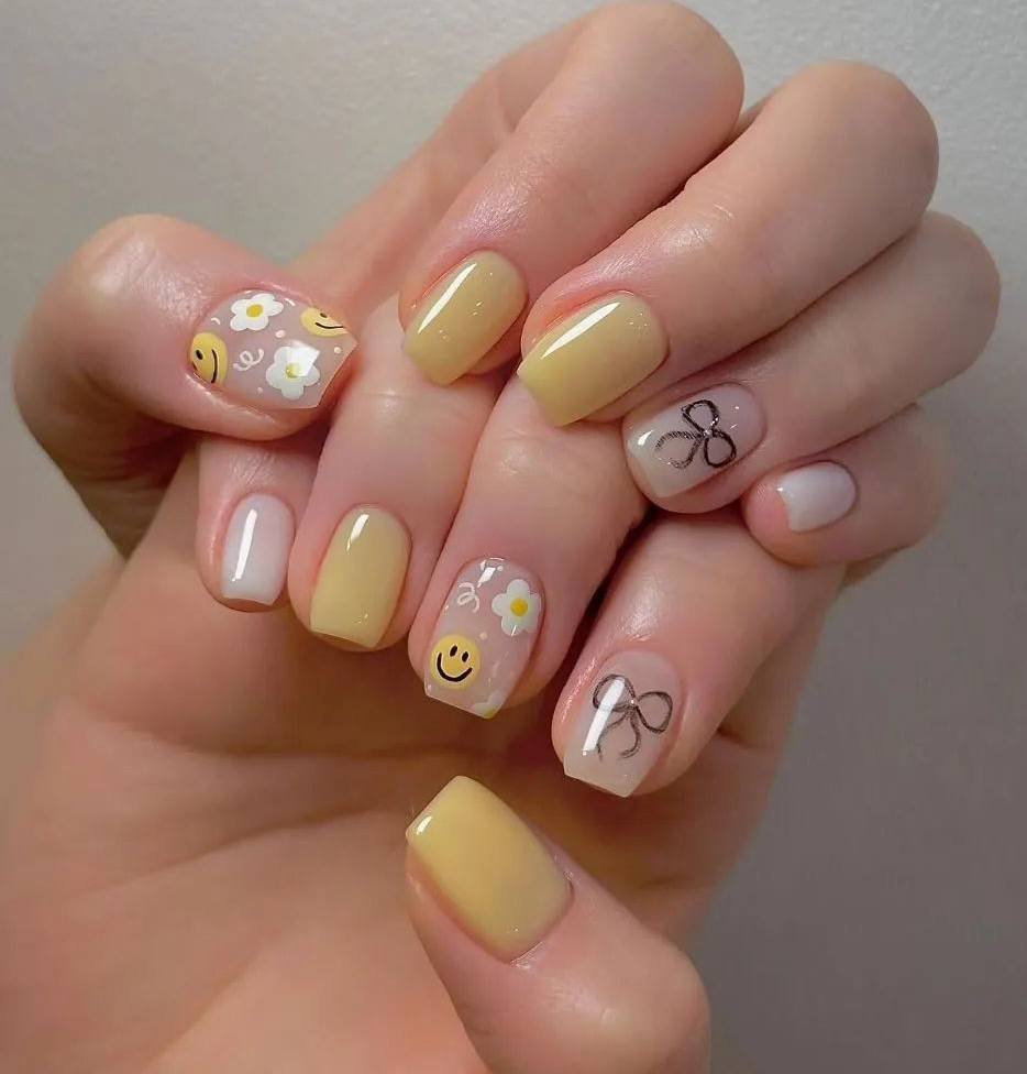 This design proves that simple can still be adorable. The clear nude base lets the tiny yellow smiley faces stand out in a soft, subtle way. I love how spaced out the smileys are, making the nails feel airy and natural. This is such a good option if you like short nails and want something playful without going overboard. It feels relaxed and effortlessly cute.